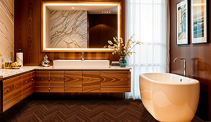 Если пол нужен в ванную, на балконе или на коммерческий объект, где пол будет постоянно контактировать с водой — лучше выбрать абсолютно водонепроницаемый кварц-винил.